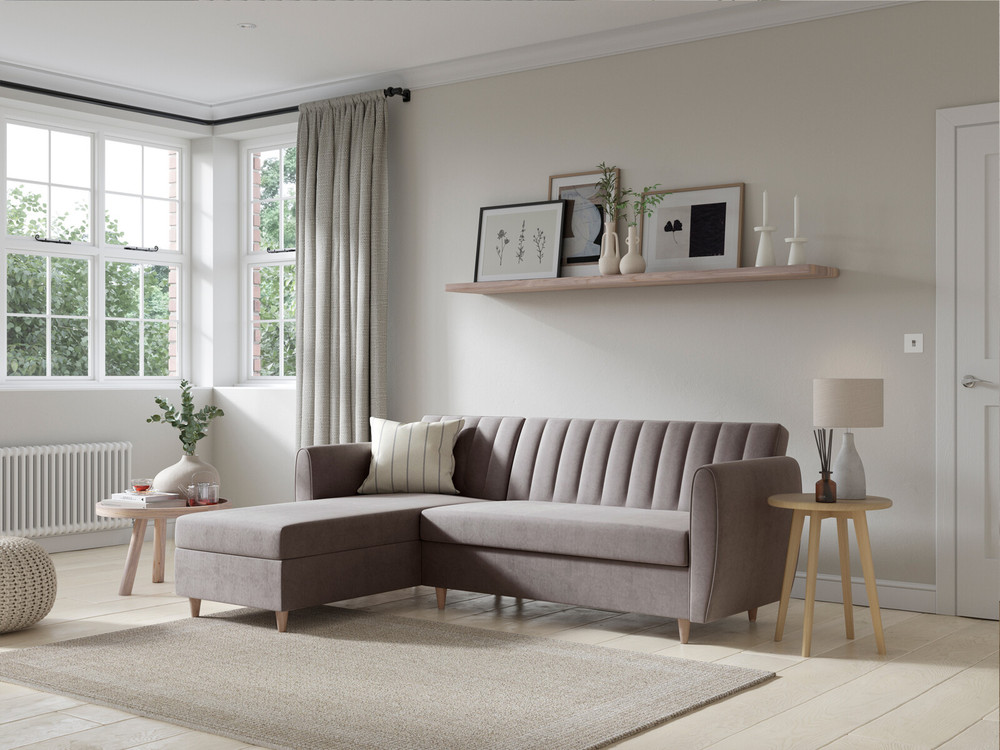 This luxurious L shaped sofa bed will be a style staple in any contemporary living space, whether it’s the living room, kitchen, or guest bedroom. The eye-catching fluted detail on the backrest, along with the unique oval arms, add to the on trend design and create a premium aesthetic. Blending perfectly within modern décor, the luxury velvet fabric comes in a stylish Slate Grey.