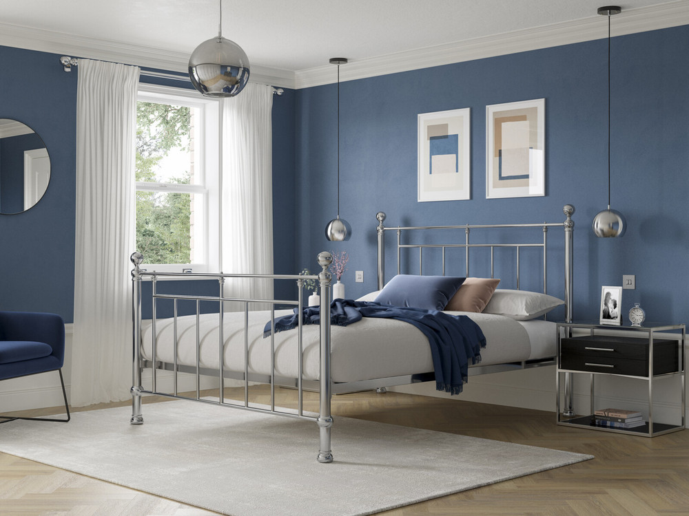 Available in black, chrome and white, the Harvard metal bed frame is complete with matching feet and features in the relevant colours.