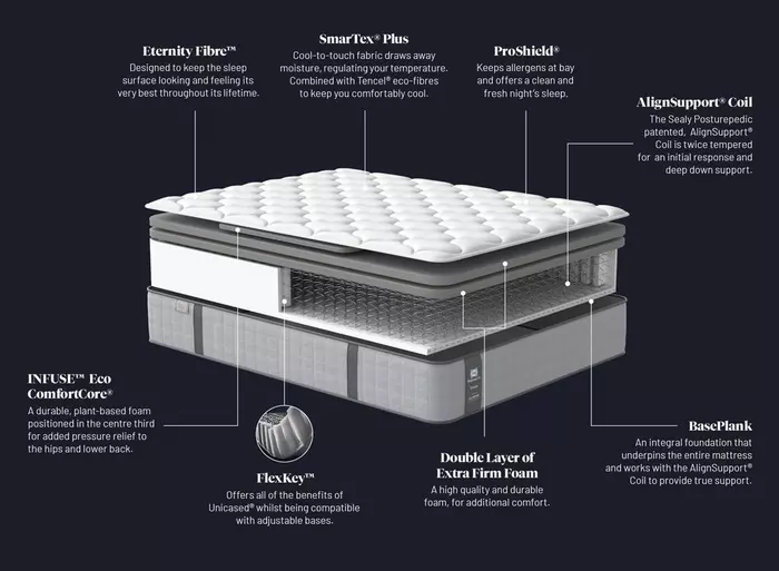 Discover the Sealy Posturepedic mattress, designed for exceptional comfort and support. Featuring plant-based Eco ComfortCore® foam and patented AlignSupport® coils, it delivers firm, pressure-relieving support for your back and joints, while UniCased® edges maximise your sleep space. Finished with a soft, breathable cover that stays cool and protects against allergens, this mattress is built for lasting comfort and peace of mind.